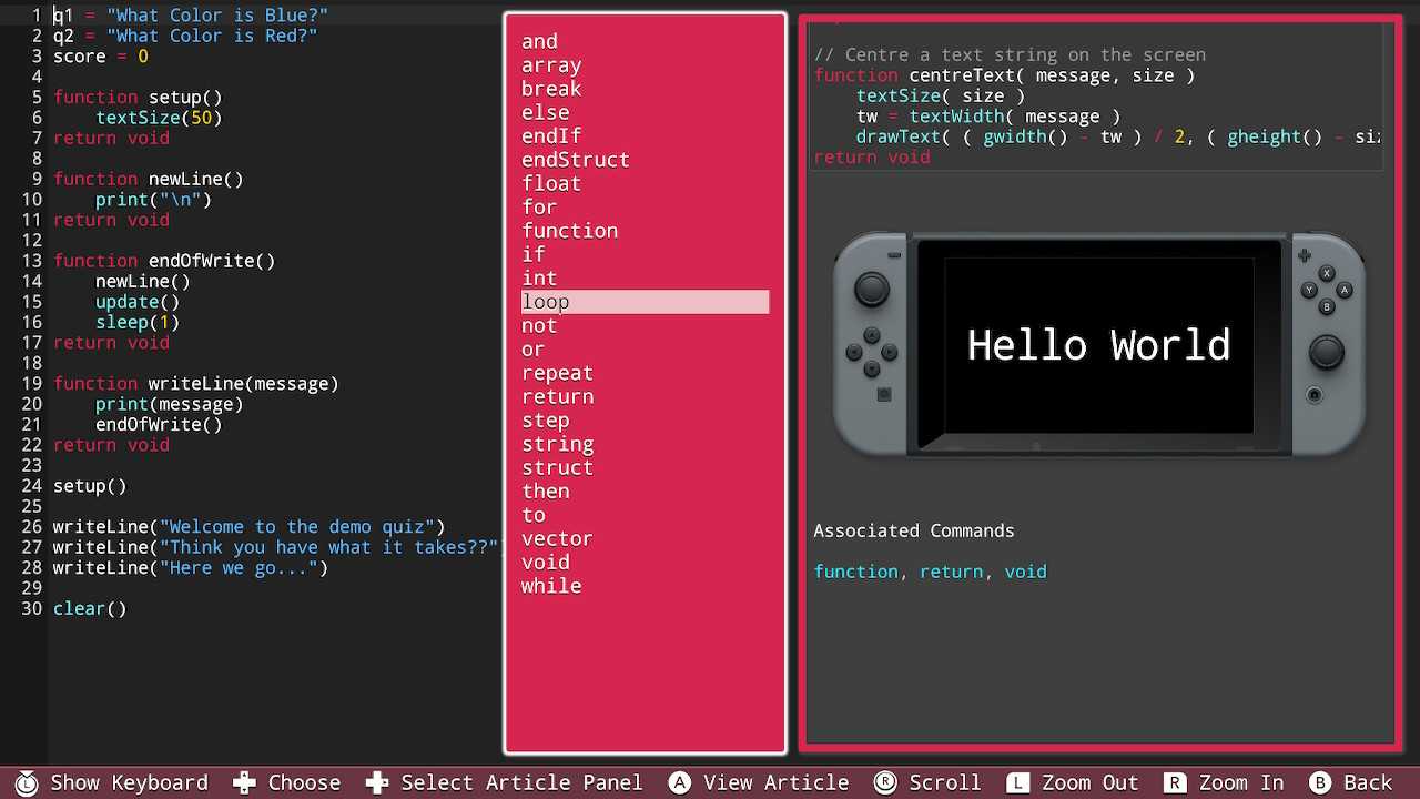 In terms of other support, there's a comprehensive suite of docs to work with, explaining the core concepts of the language, and a suite of tutorials from 'Hello World' to full game development. There's API references as well to integrate with the Switch hardware.