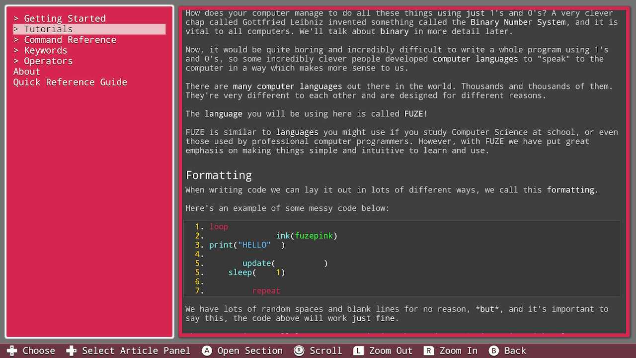 But with this change I've had my reservations towards some products that claim to 'teach you to code'. My main doubt being products that use a proprietary or unknown language. In today's world of online learning, using a custom 'training-wheels' language instead of a 'industrial' language like JavaScript or Python seems counter intuitive ("if you're going to learn programming, why not learn real-world programming?"), furthermore it results in having to learn the difference between a 'training-wheels' language and an 'industry' language. So how does 'Fuze4 Nintendo Switch' 'stack up' as an entry-level programming learning game?