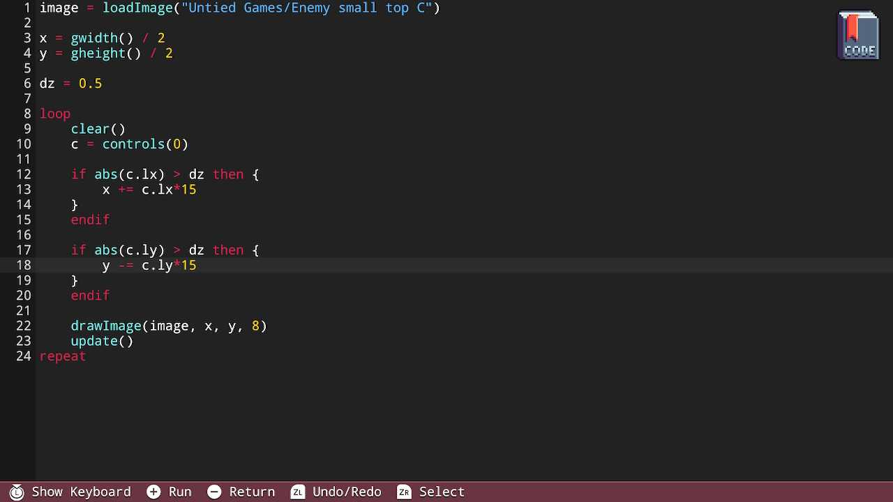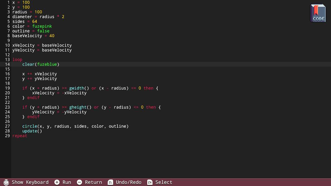 By the end of my adventures with Fuze, I was generating moving shapes and sprites on screen calculating their positions and boundaries just as I've done in my professional life. I was listening to controller interactions and tackling the common quirks with locking/unlocking inputs in a loop, and refactoring my code into reusable functions.