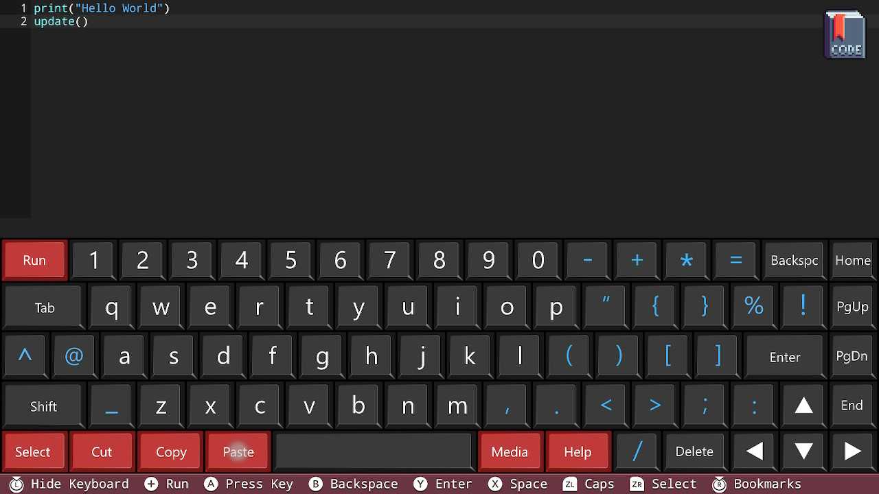 There's no mouse support sadly, but the more I used the editor, the less I found myself reaching for the unplugged mouse on my desk. JoyCon and bluetooth 3rd-party controllers are supported, providing using build/run/cancel operations from the press of a (physical) button, and the controller buttons also prompt other handy functions such as showing/hiding the keyboard and documentation.