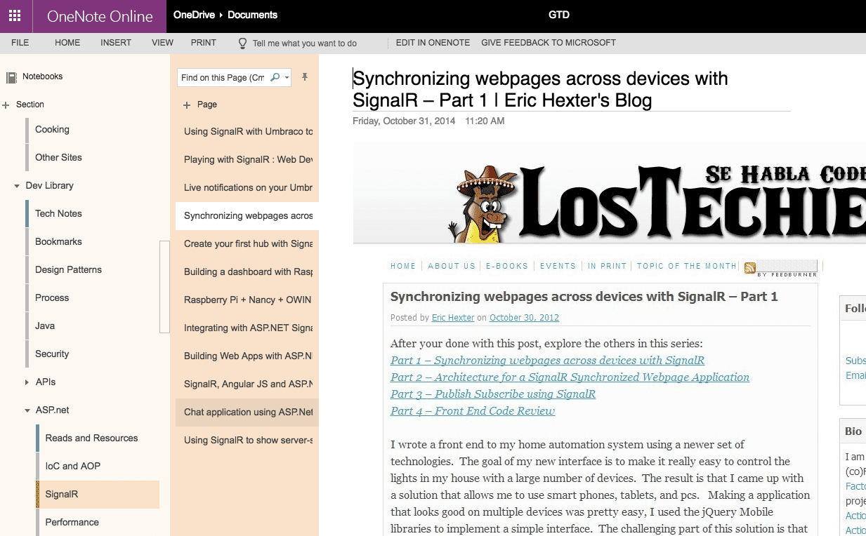 - Microsoft OneNote — I love OneNote. When Microsoft reinvented Office for the cloud, OneNote went from being ‘the new guy’ to being ‘the rock star’ of Office. I use OneNote for all ‘useful information’. As an engineer I may find 5–20 useful articles in a single day that I want to keep on top of. I may also want to write notes whilst using my Tablet, or jot down some random piece of info on my phone out and about. Having OneNote in the cloud solves all this.__ For OneNote I use a ‘Collection Box’ section and create individual notes for each item. OneNote is powerful for collecting articles. If I find a useful article on my rss feeds or someone sends me a link, I use the OneNote clipper to __clip the entire page. OneNote then sends a copy of the whole page (and the source url) into my OneNote where I’ve got an easy to access item. I save it for later and forget about it.