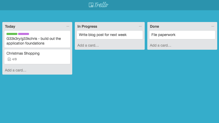 Within my trello I have my ‘today’ list, an ‘in progress’ list and a ‘done’ list. Whenever I’m actively working on something I move the item into ‘in progress’ and the ‘done’ when it’s (surprise surprise) done. Why do I do this? Control.
