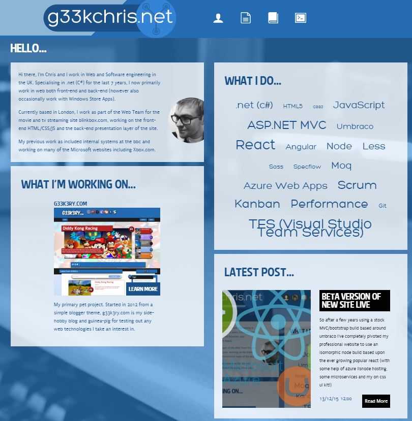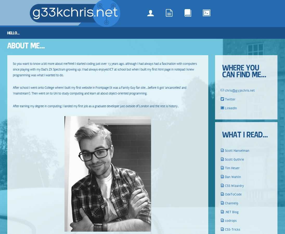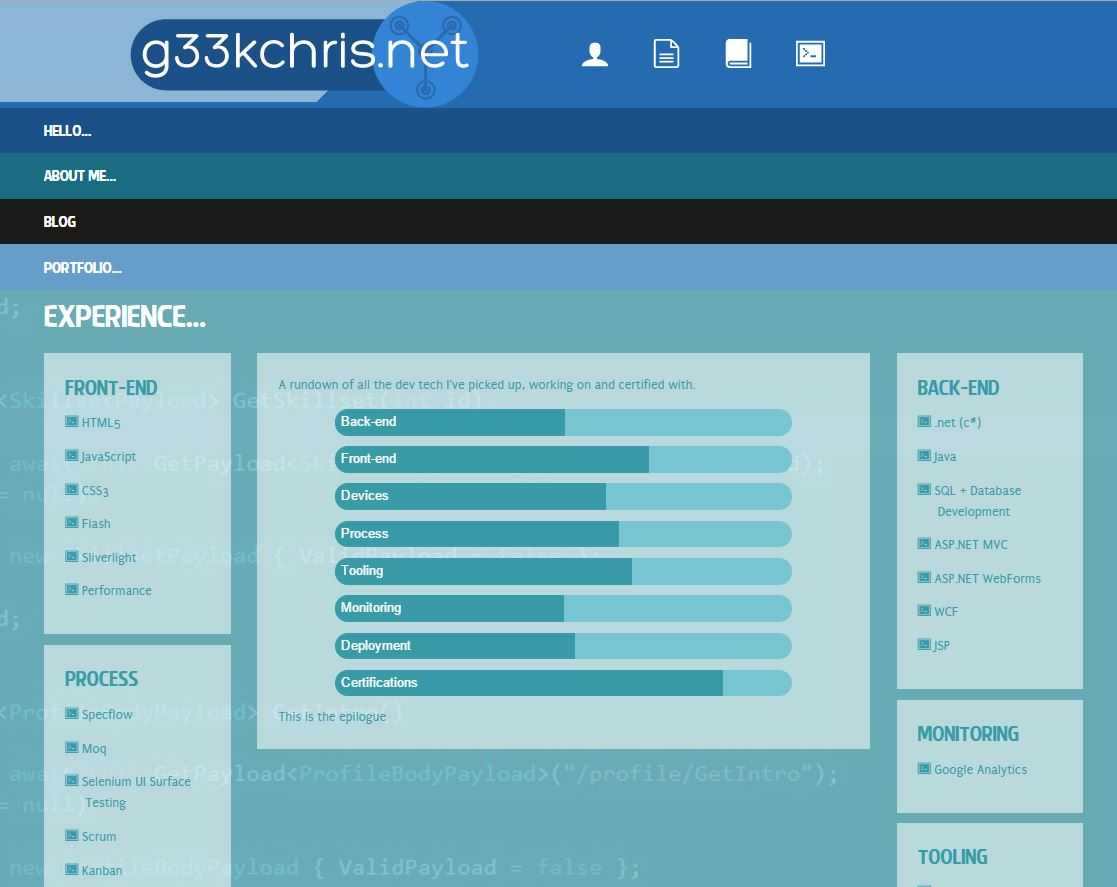 g33kchris.net is my professional portfolio, blog and platform for showcasing experimental code. It documents my career as an engineer, and my skills and projects I have accumulated along the way.