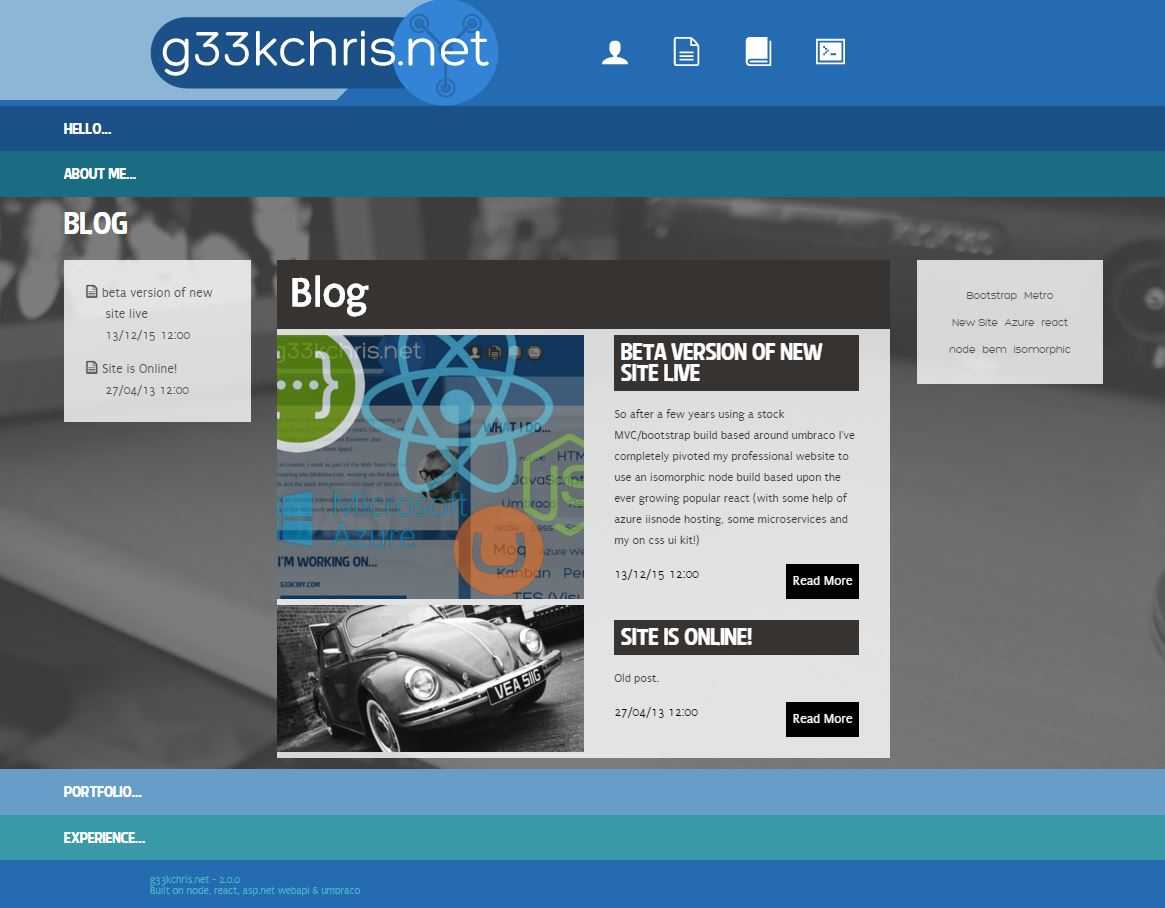 Initially built as an Umbraco based ASP.net MVC site. My site has now had a complete rebuild and migration from the original CMS. Over time it has evolved from being a server rendered website, to a single page application, and now a static website built upon gatsbyjs.