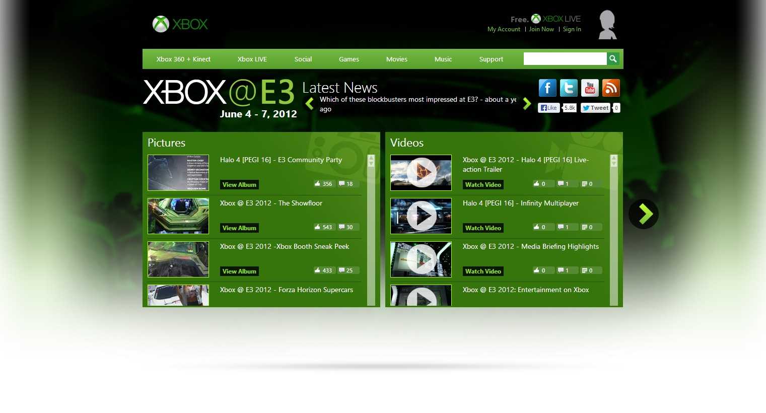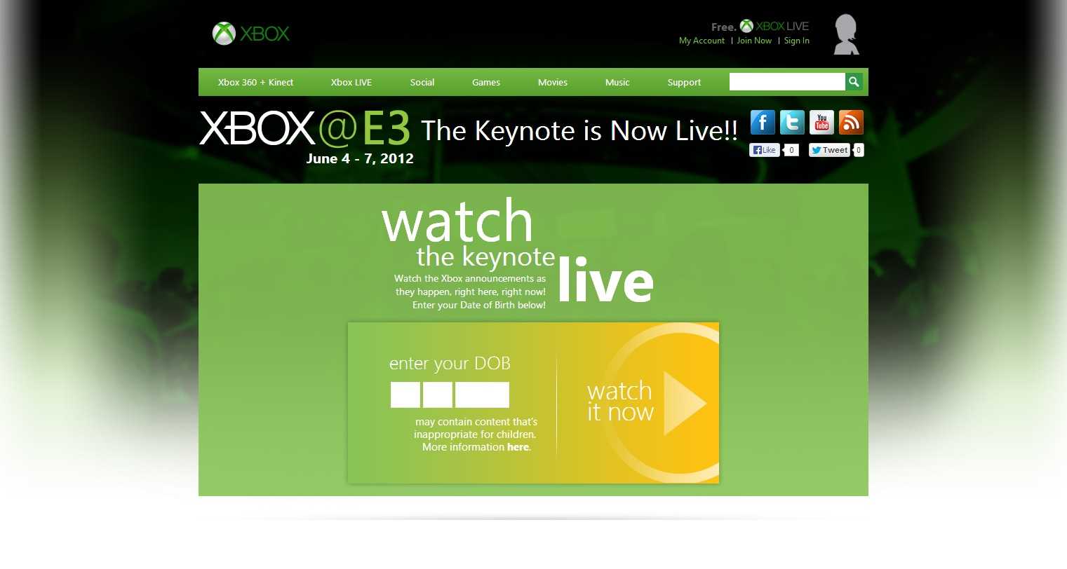 The 2012 build was more ambitious, and shelved Silverlight in exchange for HTML5. The 2012 site also included news and coverage from LA, however this time the data was being sourced directly from Xbox facebook's photo albums and live facebook posts. It also used trailers and promo videos being uploaded to YouTube. Both facebook and YouTube were then consumed via their JavaScript apis.